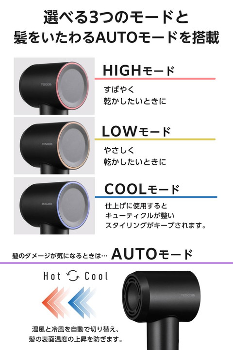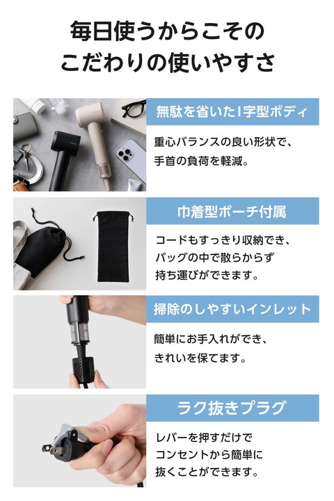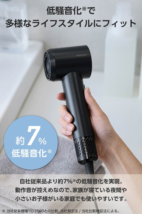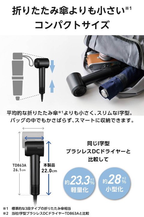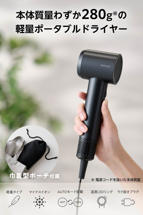 驚くほどの軽さで持ち運びも手軽に。本体質量約280g(※1)で、平均的な折りたたみ傘(※2)よりもコンパクトなI字型ヘアドライヤーです。グリップ内蔵のモーターで重心バランスが良く、手首への負担を軽減。コンパクトながらパワフルな風で、髪の根元からすばやく乾かせます。 ※1:電源コードを除く本体質量 ※2:標準的な3段タイプの折りたたみ傘相当![]() ■テスコム最軽量(※1)を実現!同じI字型ブラシレスDCドライヤーと比較して約23.3%軽量化(※2)し、本体質量わずか約280g(※3)。ジムや旅行などでも手軽に持ち運べます。 ※1:2026年2月、当社高速ブラシレスDCモーター搭載ドライヤーにおいて ※2:当社I字型ブラシレスDCドライヤーTD863Aと比較 ※3:電源コードを除く本体質量 ■同じI字型ブラシレスDCドライヤーと比較して、約28%小型化(※1)した高さ約220mmのコンパクトサイズ。平均的な折りたたみ傘(※2)よりも小さく、スリムなI字型なので、バッグにもスマートに収納できてかさばりません。 ※1:当社I字型ブラシレスDCドライヤーTD863Aと比較 ※2:標準的な3段タイプの折りたたみ傘相当 ■高速ブラシレスDCモーターを搭載し、コンパクトながらパワフルな風で、髪を根元からすばやく乾かします。モーターに摩耗するパーツがないので、長寿命1,000時間(※)で長く安心して使えます。 ※:モーター単体での仕様 ■ノズルを短くして無駄を省いたI字型のボディで、頭部周りでも使いやすくしっかり乾かせます。モーターをグリップに内蔵した重心バランスの良い形状なので、ドライヤーを振る際に手首の負荷を軽減します。 ■好みの温度を選べる、HIGH/LOW/COOL/AUTOの4つのモードを搭載し、温度に合わせて温度LEDリングの色が変化します。AUTOモードは温風と冷風を自動で切り替え、髪への熱ダメージを抑制しながらやさしく乾かします。 ■放出イオン量約1,000万個/cm3以上(※)のマイナスイオンが、髪の広がりの一因となる静電気を低減。髪のツヤもアップします。 ※当社測定法/当社比較検証法による ■出し入れが簡単な巾着型ポーチ付きで、コードもすっきり収納できます。バッグの中で散らからず、持ち運びにも便利です。 ■ラク抜きプラグで取り外し簡単。レバーを押すだけでコンセントから簡単に抜くことができます。 ■電源コードがスッキリまとまるクイックコードバンド付きです。 ■お掃除しやすいインレットネット。着脱が簡単でお掃除がラクだから、いつでもきれいを保てます。 ■インテリアと調和する落ち着いたカラーリングのブラック、ベージュの2色をご用意。やわらかく上品なマット質感とミニマルなシルエットが美しいデザインです。 ■1965年の創業以来、テスコムが製造・開発してきた業務用ドライヤー『Nobby』は、高い性能からサロンシェアNo.1(数量ベース)(※)を獲得。その技術力が活かされています。 ■※2024年4月〜2025年3月の国内美容院(サロン)への業務利用ドライヤー販売荷数(サロンでの販売分除く)(東京商工リサーチ調べ) ![]() ■電源:AC100V 50Hz/60Hz ■消費電力:1200W ■風量(m3/分):0.8m3/分(JIS規格 TURBO使用時) ■温風温度:100℃(周囲温度30℃の場合 TURBO-HIGH使用時) ■搭載イオン:マイナスイオン ■スイッチ:切替スイッチ:TURBO/SET/OFF、MODEスイッチ:HIGH/LOW/COOL/AUTO ■外形寸法:幅約76mm×奥行約62mm×高さ約220mm(本体のみ) ■質量:約385g(本体のみ 電源コード含む)、約280g(電源コード含まない) ■主材料:本体:ポリカーボネート ■カラー:ブラック ■コード長:1.7m ■ラク抜きプラグ:○ ■折りたたみ:× ■海外使用:× ■付属品:ポーチ ■保証期間:1年間 |