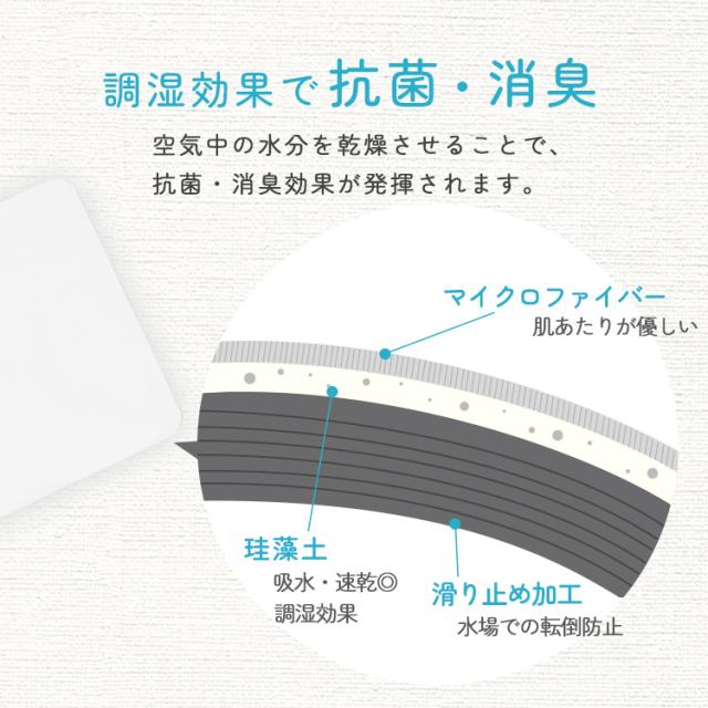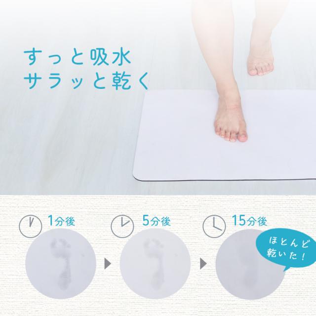 珪藻土の持つ優れた吸水性で、湯上りの濡れた足の裏の水分をすばやく吸い取ってくれます。