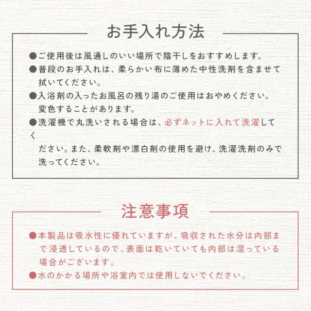 ・浴槽内には持ち込まないで下さい。 ・素材の劣化につながりますので、長時間水に浸さないで下さい。 ・自然乾燥しますので、毎回乾かす必要はありませんが、カビ発生の防止効果のため、時々風通しのよい場所で陰干しをして下さい。 ・割れ、反りの原因となりますので、天日乾燥は避けて下さい。 ・珪藻土が成分の為、素材の特性上、表面上にムラ・軽微なキズなど・茶色や黒の斑点がある場合がございますが品質上問題はございませんのでご了承下さい。 ・使用後は風通しのいい場所で陰干しをおすすめします。 ・吸水性に優れていますが、吸収された水分は内部まで浸透しているので、表面は乾いていても内部は湿っている場合がございます。 ・商品は、モニターによって色合いが異なって見える場合があります。 ・仕様・デザインは改良のため予告なく変更することがあります。 |