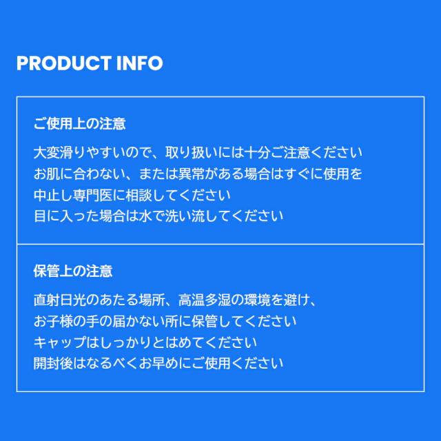 ・大変滑りやすいので取り扱いには十分ご注意ください。 ・お肌に異常を感じた場合は直ちに使用を中止し、専門医にご相談ください。 |