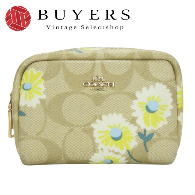 中古 コーチ ポーチ ミニ ボクシー C3054 コスメティックケース シグネチャー PVC ライトカーキ ホワイト 小物入れ 化粧ポーチ デイジープリント レディース 女性 COACH