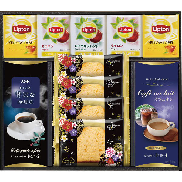 ●金澤兼六製菓オリジナルケーキ(プレーン)×4、リプトン イエローラベルティーバッグ2g・リプトン セイロンティーバッグ2.2g×各2、リプトン ロイヤルブレンドティーバッグ2.2g・AGFちょっと贅沢な珈琲店スペシャルブレンド(ドリップ)(7g×2)・カフェオレ(スティック)(12g×4)×各1
