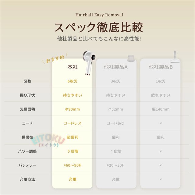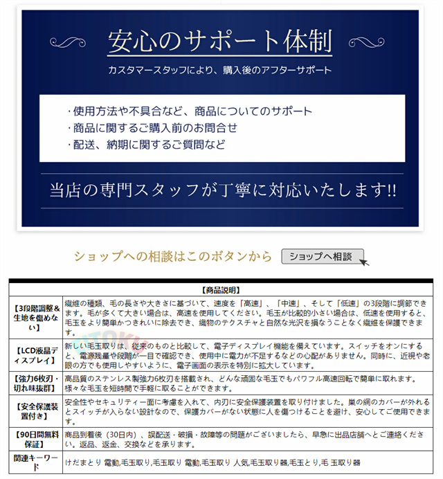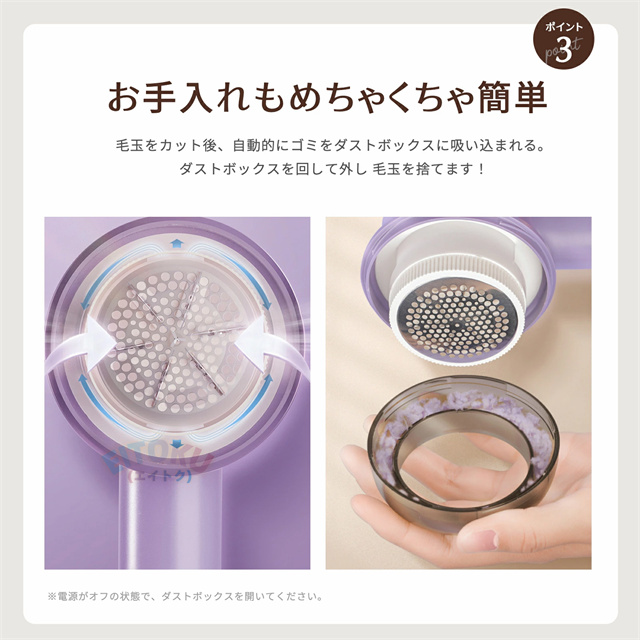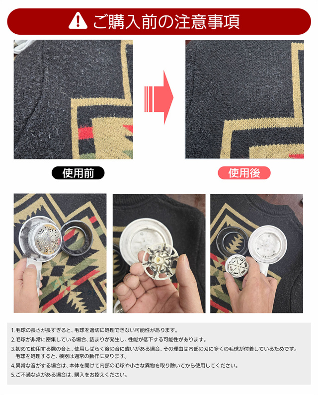 高品質のステンレス製強力6枚刃を搭載され、どんな頑固な毛玉でもパワフル高速回転で簡単に取れます。