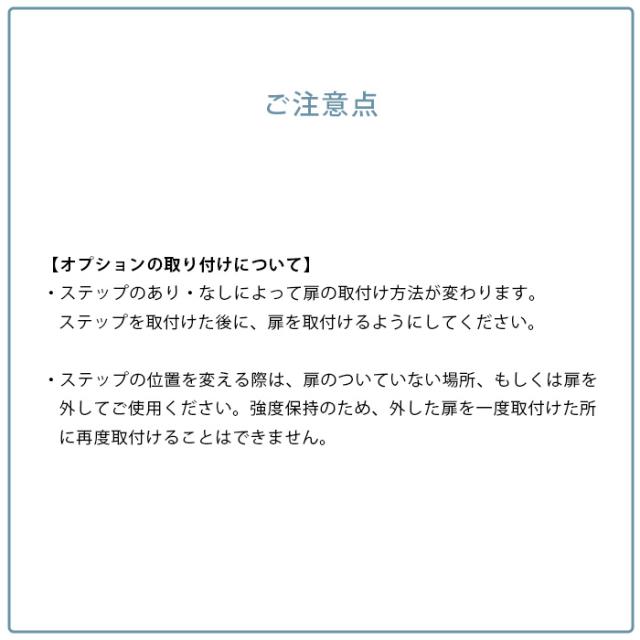 ・ステップの位置を変える際は、扉のついていない場所、もしくは扉を外してご使用ください。強度保持のため、外した扉を一度取付けた所に再度取付けることはできません。