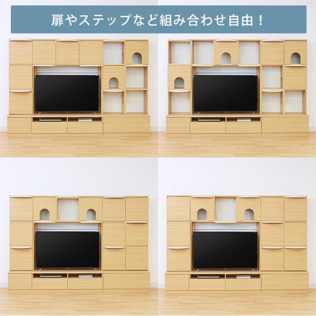 扉やステップはどの位置にも取り付け可!ライフスタイルに合わせて猫ちゃんのためのスペース、人間のための収納スペースを自由に決めらます。