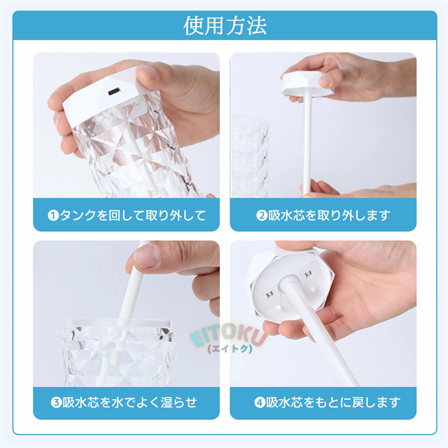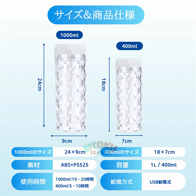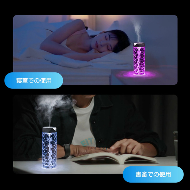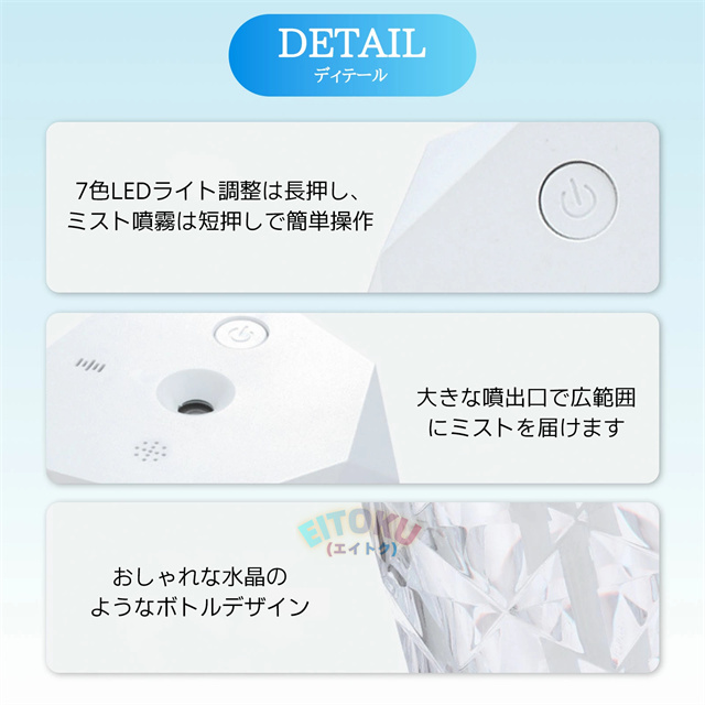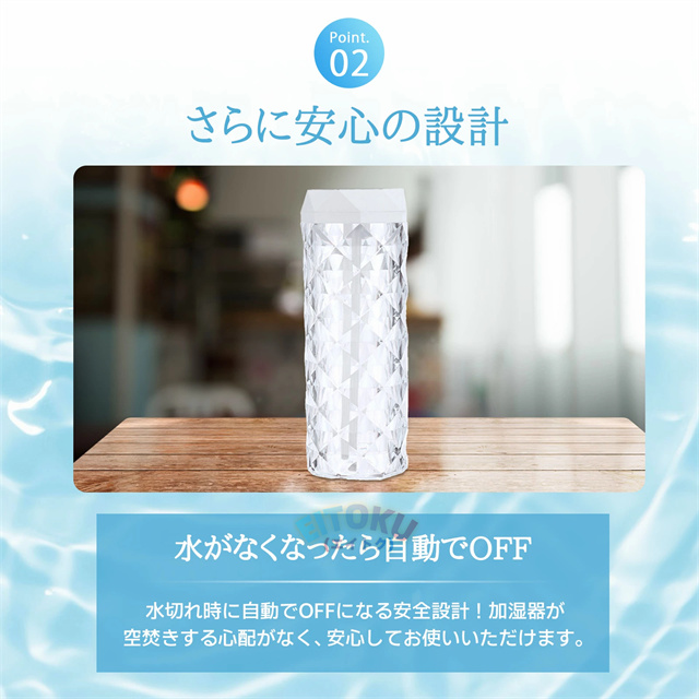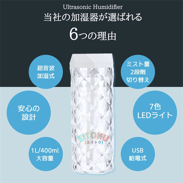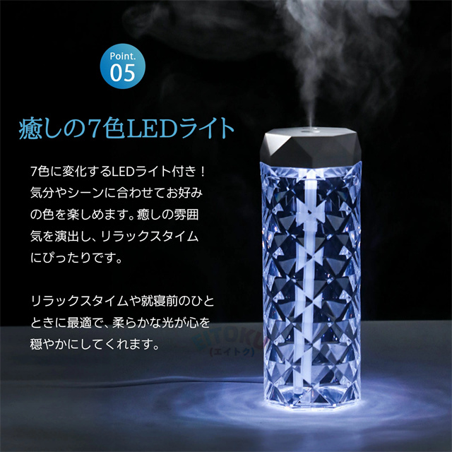 立体的な薔薇をモチーフにしたクリスタルデザイン 七色の雰囲気ライトで幻想的な空間を演出 大容量1Lタンクで連続10時間/間欠20時間使用可能 美しい光の屈折で どの角度からも魅力的な輝き