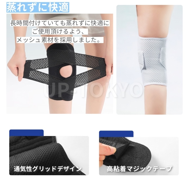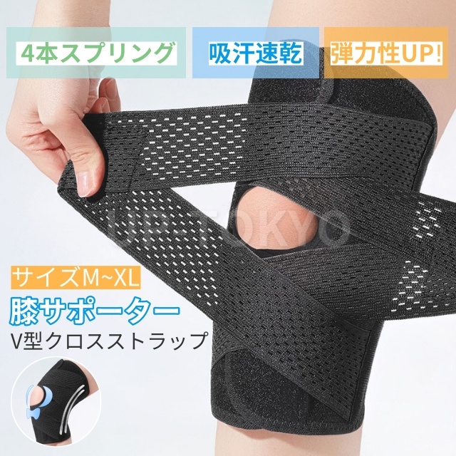 膝に巻くV型マジックテープを2本追加し、膝の上下に交差して、膝蓋骨の安定に役立ちます。左右のぐらつきも防止しながら、今までにない最高のホールド感を体験できる膝サポーター。