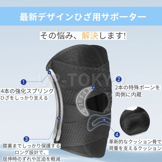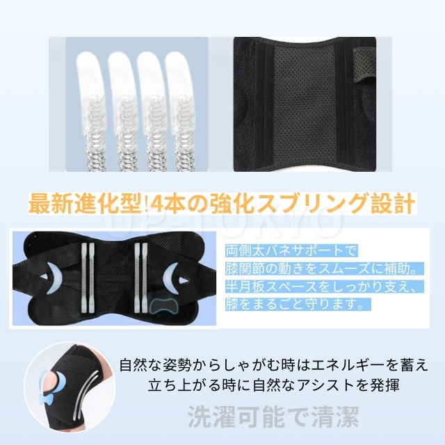 膝サポーターの両側に2本ずつのスプリングを内蔵し、関節の自然な動きとともに流れるように設計されており、運動や激しい活動時に着用するのに理想的なブレースです。