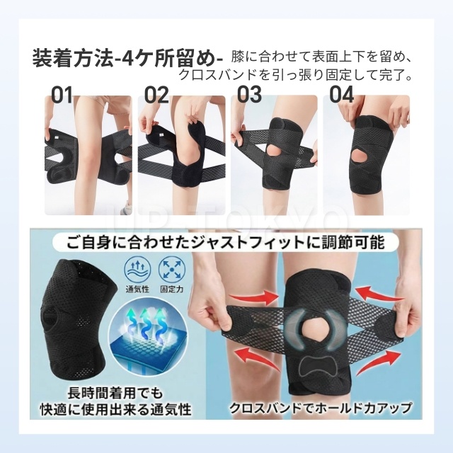 ボトムを履いたまま簡単に着け外しできるフルオープンタイプの膝サポーターです。