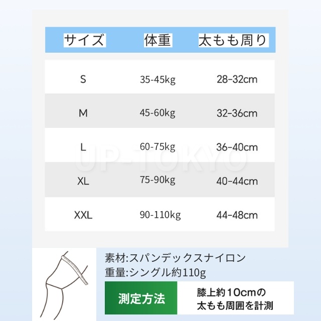 普通に立った状態でメジャーでヒザのお皿の中心から、10cm上の太ももの太さに合わせ計測