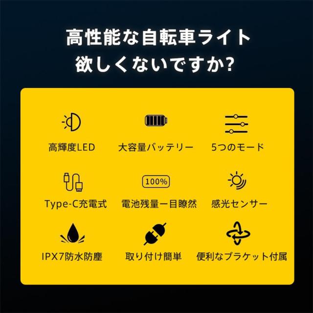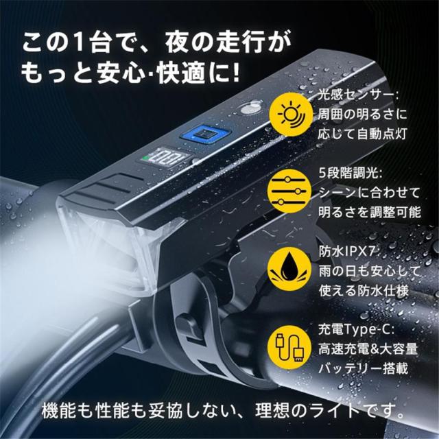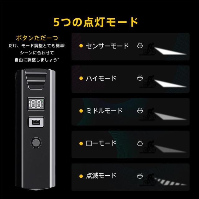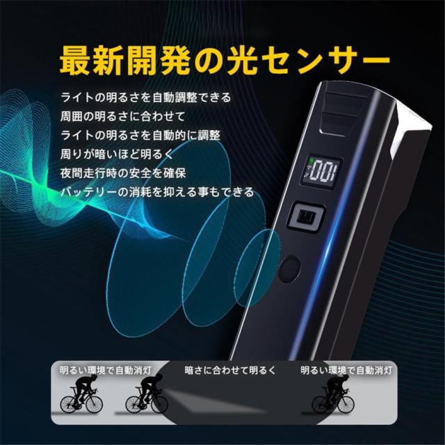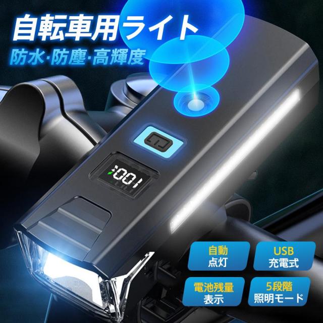 自転車ライト 自転車用ライト 感光センサー 高輝度 懐中電灯 USB充電式 電池残量表示 5段階照明モード 自動点灯 防水 防眩設計 LED 明るい