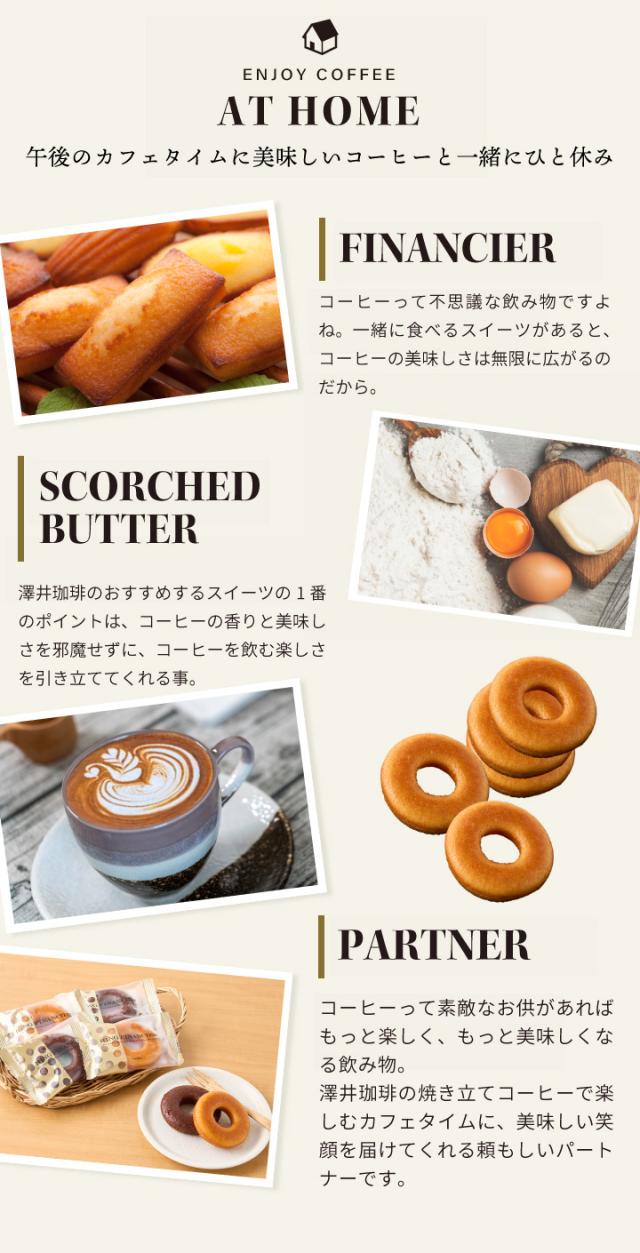 | SAWAI COFFEEのリングフィナンシェは、しっとり、もちもちとした食感が特徴の美味しいスイーツです。アーモンドと焦がしバターの香りがコーヒーとの相性を引き立て、どなたでも安心して楽しめる控えめな甘さ。コーヒータイムをより楽しく、笑顔にしてくれる一品です。 1. コーヒーと一緒に楽しむための完璧なパートナー このリングフィナンシェは、コーヒータイムに最適なスイーツとして設計されています。上質なアーモンドと焦がしバターが香ばしい風味を生み出し、しっとりとした食感が口の中で広がります。コーヒーとの相性を最優先に考えられたレシピで作られているため、コーヒーの豊かな味わいを邪魔することなく、むしろ引き立てます。特に澤井珈琲の淹れたてのコーヒーと組み合わせると、フィナンシェの香りとコーヒーの芳香が溶け合い、カフェタイムにさらに深い楽しさを与えてくれるでしょう。 2. 子どもから大人まで楽しめる安心の味 このフィナンシェの特徴は、甘さ控えめであること。上質なバターと小麦を使い、安心して食べられるように作られているため、お子様から大人の方まで楽しめます。アーモンドとバターのシンプルな香りと食感が、年齢を問わず誰にでも好まれる優しい味わいを実現。素材の味を大切にし、コーヒーの風味を邪魔せずに寄り添うような美味しさなので、家族みんなで安心して楽しめるスイーツです。 3. チョコレート好きにも嬉しいバリエーション 「リングフィナンシェ/チョコ」は、スイーツ感がさらにアップした特別なバージョンです。生地に練りこまれたチョコレートが食べ応えを増し、プレーンタイプのフィナンシェよりもデザート感が強調されています。淹れたてのコーヒーと合わせれば、チョコレートの甘さとコーヒーの苦味が絶妙に調和し、まさに至福のひとときに。甘さ控えめなため、大人の方にも満足いただける、ちょうど良いバランスの取れたスイーツです。 | |