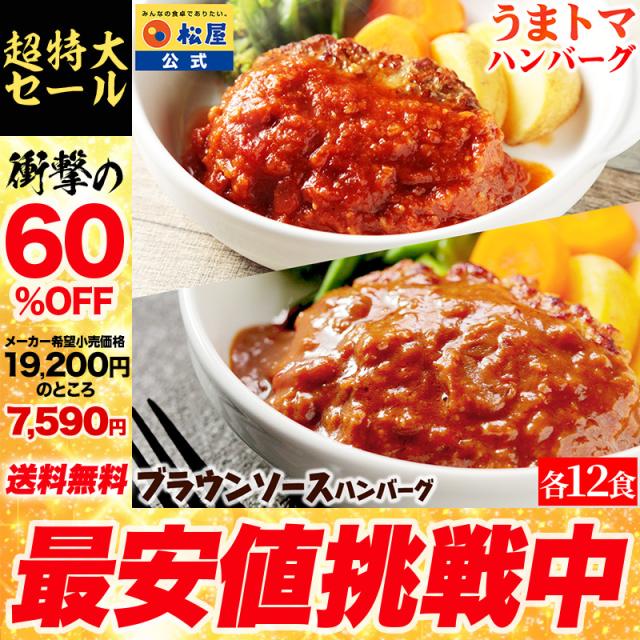 【衝撃の60%OFF】どっちがうまい?超人気ハンバーグ味比べ福袋! 松屋 公式 うまトマハンバーグ と ブラウンソースハンバーグ 各12食 計24食 うまトマ ハンバーグ トマト にんにく トマトソース ブラウン 非常食 セール 半額