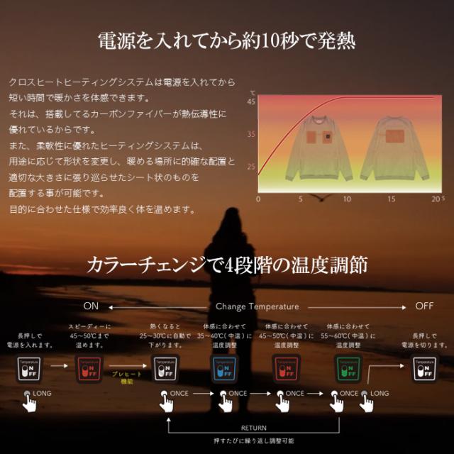 ■商品特徴 CROSS HEAT R00 ヒーティングシステムは、わずか数秒で発熱する高性能電熱ベストです。 熱伝導性に優れたカーボンファイバー(炭素繊維)を採用し、背中とお腹をしっかり温めます。 温度は4段階調整に対応。さらにプレヒート機能(自動温度調整)を搭載し、最適な暖かさをキープします。 柔軟性のあるヒーティングシートを内蔵しているため、動きやすく、 作業着としてもアウトドア・ツーリング・キャンプ・通勤・釣りなどあらゆる冬のシーンで活躍します。 ■防水仕様のシリコンコントローラ搭載 完全防水のシリコンコントローラを採用。 電源のON/OFFや温度切替をワンタッチ操作でき、LEDで発熱レベルを視認可能。 約200回の手洗いテスト(自社基準)をクリアし、安心して洗濯可能です。 (※ドライクリーニングは不可) ■高性能リチウムポリマーバッテリー採用 従来のニッカド電池より約1.5倍の容量を確保したリチウムポリマーバッテリーを採用。 小型・軽量ながら長時間発熱を実現し、寒冷地や屋外現場でも快適に使用できます。 【バッテリー仕様】 容量:20,000mAh(3.7V 約74Wh) 定格出力容量:約12,000mAh 出力ポート:USB-A×2、USB-C×1 入力ポート:USB-C、Micro USB 本体重量:約340g サイズ:約130×68×25mm カラー:ブラック 付属品:充電ケーブル(Type-C) ■PSE認証 届出事業者名:株式会社リブレ PSマークの種類:丸形PSE ※CROSS HEATシリーズの電熱ウェアすべてに互換性があります。 ■主な特長まとめ 【即暖】数秒で発熱するカーボンファイバー内蔵 【4段階温度調整】シーンに合わせた快適温度 【プレヒート機能】自動で最適温度に調整 【防水設計】シリコンコントローラ搭載で洗濯可能 【長時間発熱】大容量リチウムバッテリー付属 【軽量設計】約340gバッテリーで持ち運び楽々 【多用途】作業・ツーリング・釣り・キャンプなど冬の防寒対策に最適 【ユニセックス】男女兼用・幅広いサイズ展開 ■使用シーン ・屋外作業 ・釣り/キャンプ/スキー/スノーボード ・ツーリング/バイク通勤 ・寒冷地での防寒対策 身近なコンビニでも用意出来る乾電池(電池ボックス)から電源を供給したり、自動車やバイクの バッテリー(DC12V)から直接電源を供給したり、様々な電源供給を可能とするオプションパーツも展開しています。 テクノロジーが生み出したクロスヒートヒーティングシステムは 世界の環境を変える新たなイノベーションです。 |
