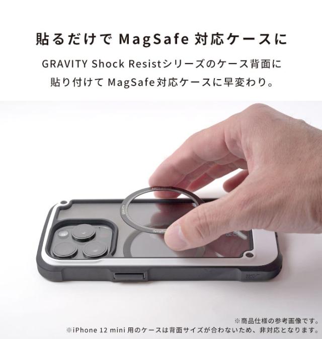 別売りのGRAVITY Shock Resistシリーズのケース背面に貼り付ける事で、MagSafe対応ケースに早変わりするメタルリング。