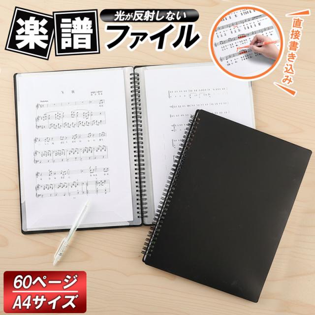 送料無料 楽譜ファイル A4 60ページ 直接書き込み 反射防止 楽譜入れ 見開き 180度展開 防水 楽譜カバー バンド 譜面 音楽 ピアノ 吹奏楽 合唱 練習 演奏会 発表会 コンクール オーケストラ 部活 整理 収納 ブラック PP素材