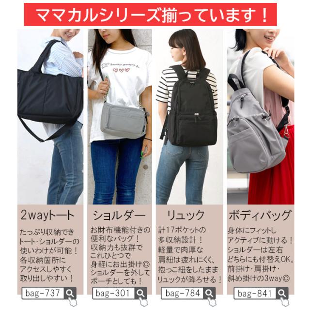 おむつポーチにもなるママカルシリーズの多機能ショルダーバッグ。