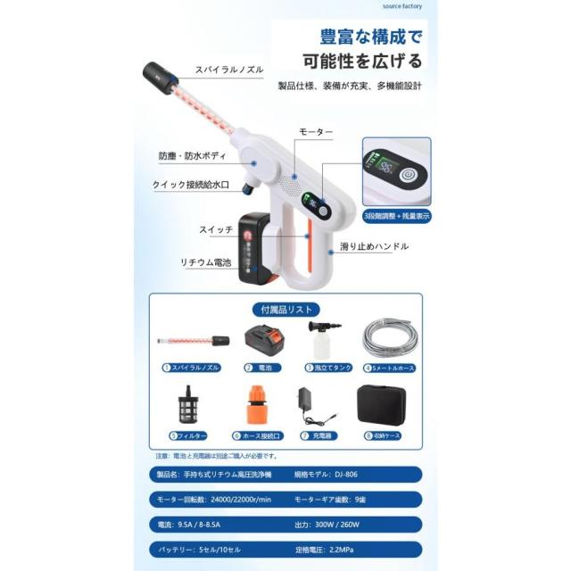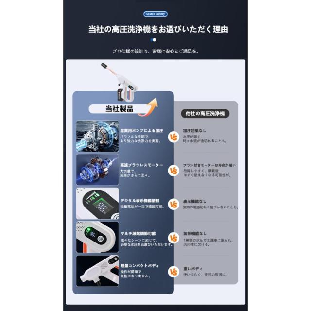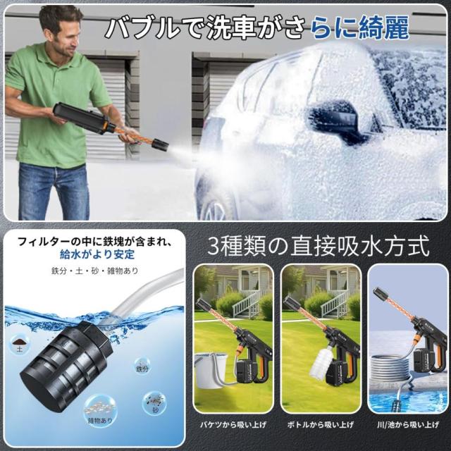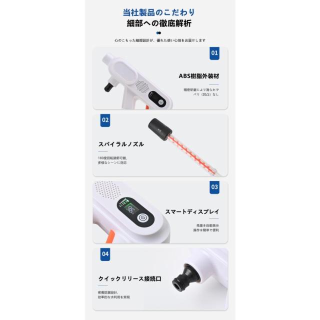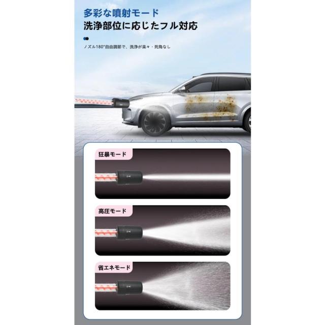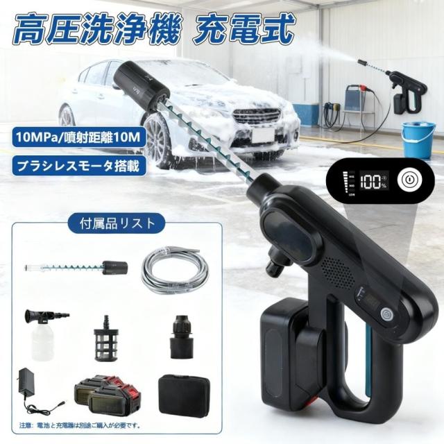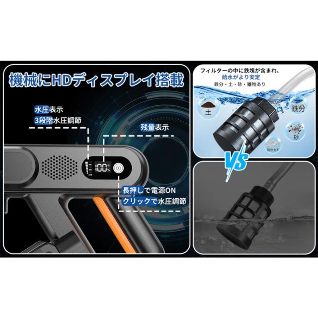 2026年新モデルとして、さらに進化した高圧洗浄機をお届けします。最新バージョンのブラシレスモータ搭載、10MPaのパワフルな水圧を実現、水圧30%上昇、洗浄効率が50%向上。高性能のブラシレスモータ、極高い安定性・耐久性と強力な出力効率。過電流保護・過電圧保護・過充電保護・過放電保護の機能があり、より安全にご利用いただけます、使用寿命が300%向上。