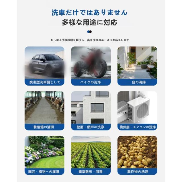 高圧洗浄機は、車の洗浄以外にも、庭や外壁など、庭の水撒き、自転車、RV車、プール、タイル、様々な場所で使用できます。汚れや落ち葉を効果的に取り除くことができ、多目的に使用できます。
