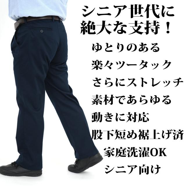 チノパン ツータック カジュアルパンツ メンズ シニア 裾上げ加工済 ストレッチ 綿混 コットン ソフトな履き心地 リラックスシルエット 短め股下サイズ 作業着 ワーキングウェア すぐはける股下ピッタリ 【送料無料】