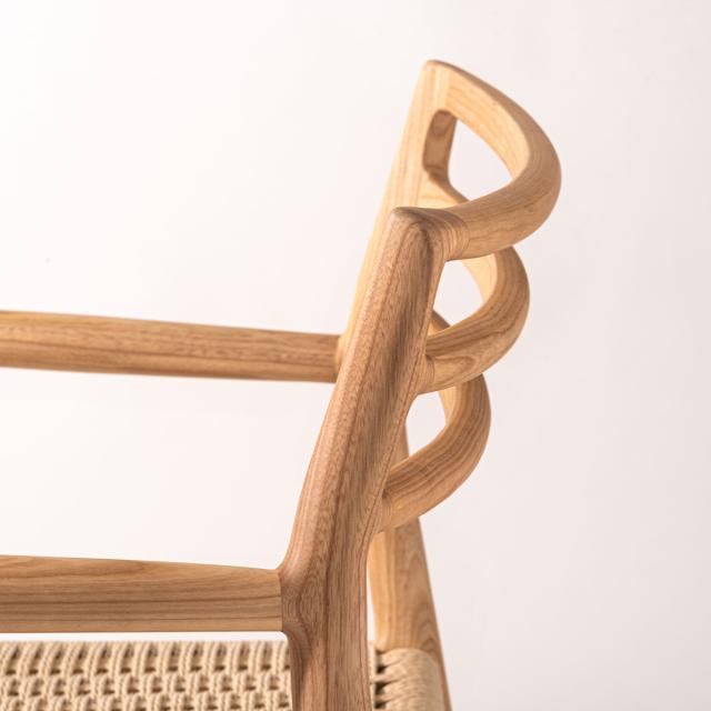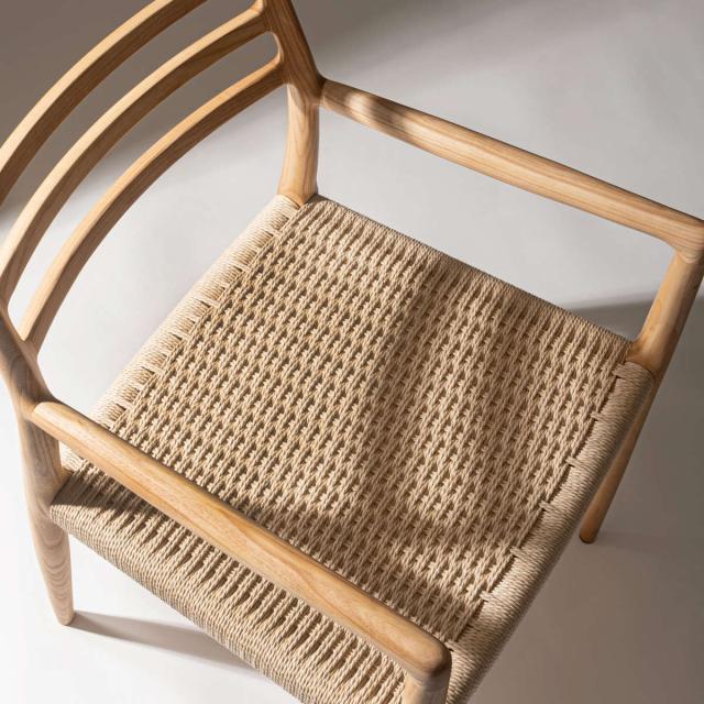 座面にぺーパーコードを使用したチェアです。ぺーパーコードは樹脂を含ませてねじった紙紐のことで、長く使うほどにお尻にフィットしてくる座り心地の良さが魅力です。革やファブリックとは一味違った、自然で軽やかな風合いをお楽しみいただけます。