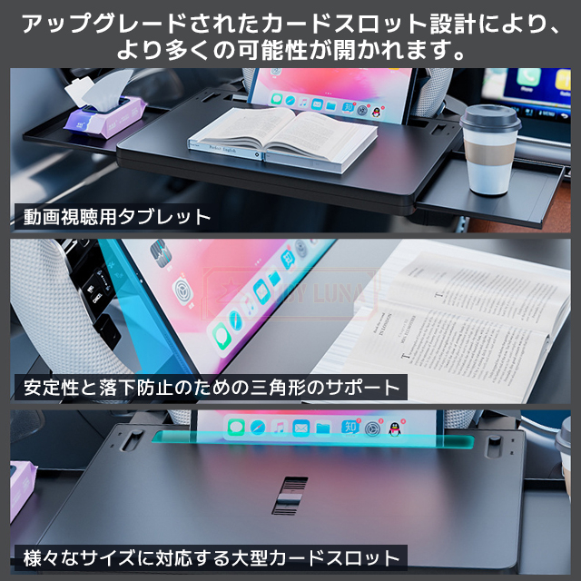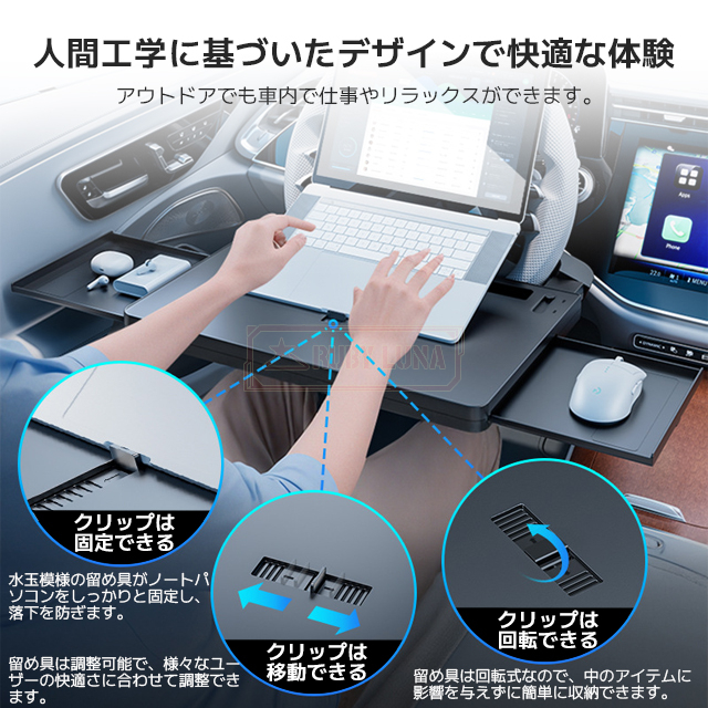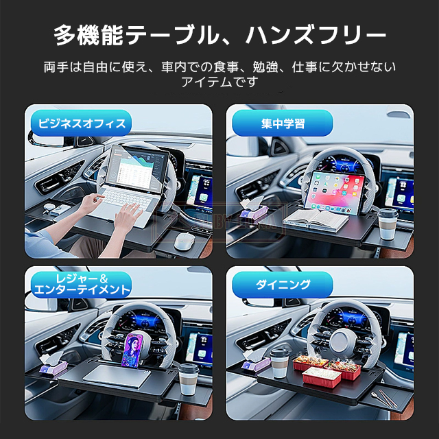 | 【便利で多機能な車載アイテム】 | ◆運転席でノートパソコン、タブレット、スマートフォンを使用したり、食事を摂ったり、飲み物を楽しんだりするための便利なテーブルです。運転席での食事や作業に最適なアイテムで、レストランで食事が難しい場合やテイクアウトの際にも便利です。さらに、縦にして座席の隙間に取り付けると、シートサイドポケットとしても使用できます。一石二鳥の便利な車載アイテムです。 |