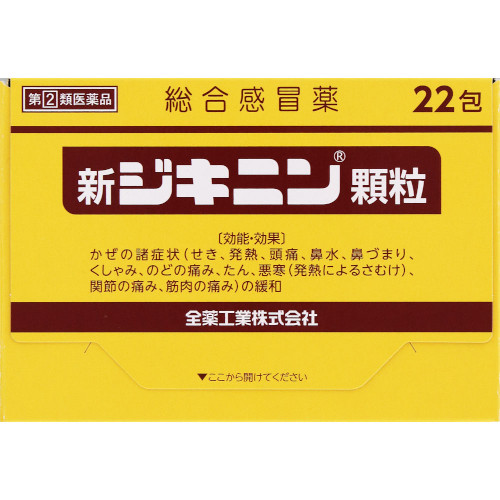 新ジキニン顆粒は、鎮咳剤ジヒドロコデインリン酸塩や解熱鎮痛剤アセトアミノフェン、鎮咳・去痰作用のある生薬カンゾウ(甘草)エキスなどの働きで、かぜに伴うせき、発熱、頭痛などの症状によく効くかぜ薬です。
