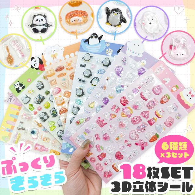 18枚セット ドロップシール 6種類×3セット ボンボンシール おはじきシール 3D 立体 シール ぷっくり キラキラ クリア 透明 かわいい 可愛い シール帳 ノート デコ デコレーション シール交換 うさぎ 動物 パンダ ペンギン パン スイーツ おばけ ハート ピンク 食べ物 小物 猫