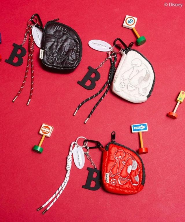 「ベイマックス」のふわっとした質感をイメージしたパフィーポーチ。大胆に描かれた手書き風の刺繍がポイント。Bのイニシャルチャームやコード付きでスポーティーな印象に仕上げました。バッグにチャーム感覚でつけられるコンパクトサイズで、小銭入れやイヤホンケースとしても便利に使えるアイテムです。