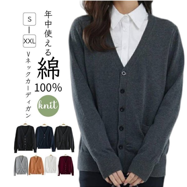 カーディガン レディース 綿100% Vネック 事務服 オフィス カーディガン 毛玉防止 毛玉になりにくい ゆったり コットン ポケット付き 体型カバー
