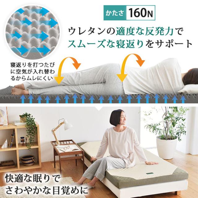 サイドと裏側には、通気性の良い《3Dメッシュ生地》を採用し、湿気がこもるのを防いでいます。マットレスはこの商品に限らず、フローリングや畳の為にも、定期的に陰干し(立てかける)することをお勧めします。