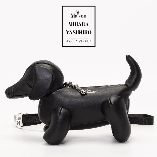 MIHARAYASUHIRO メゾンミハラヤスヒロ DOLLS DACHSHUND MINIMINI BAG A16BG718 ダックスフントモチーフ 犬モチーフ アニマルモチーフ ミニサイズ 立体デザイン 個性派デザイン デザイナーズ モード系 ストリートファッション ネックポーチ 首掛け仕様 取り外しストラップ 調整ストラップ 小物収納 ファスナー収納 チャーム使い ユニセックス 男女兼用 ブラックカラー 羊革使用 レザーアイテム