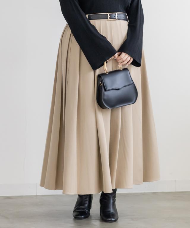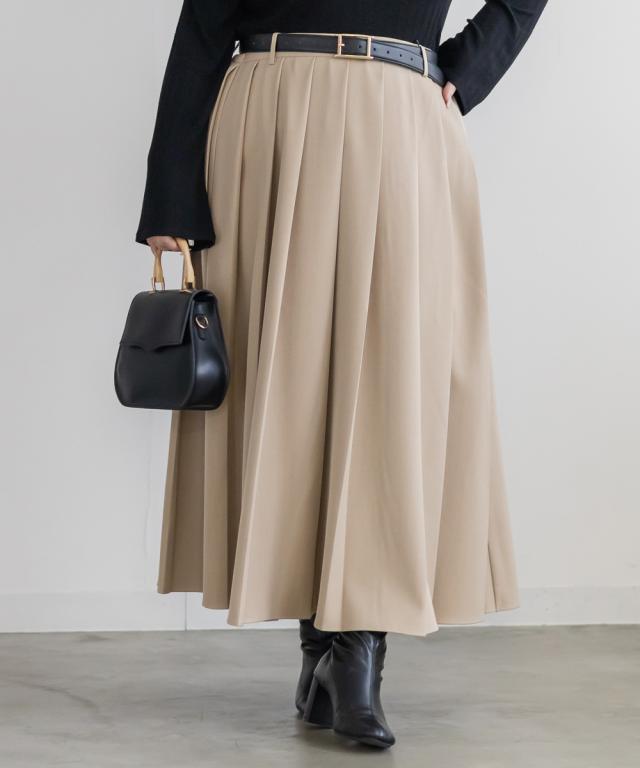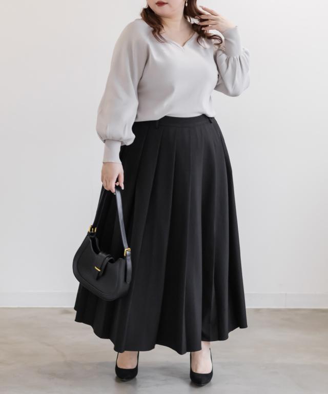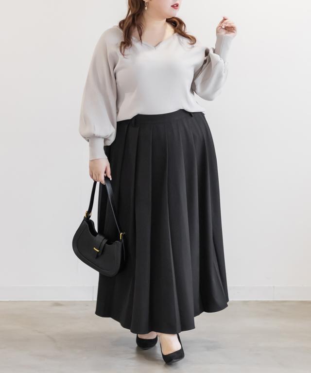 | 3Lサイズを着用しました。ウエストは後ろゴム仕様で楽に穿けるのに、プリーツの落ち感がきれいで上品見えします。トレンドコーデにぴったりです!ウエストからきれいに広がるプリーツスカートがお腹周りや腰回りをカバーしてくれて、ブーツ合わせはもちろん、フラットシューズでもヒールでもバランスよく合わせられそうです!きれいめにもカジュアルにも使えて、オンオフ問わず活躍してくれるスカートです! |