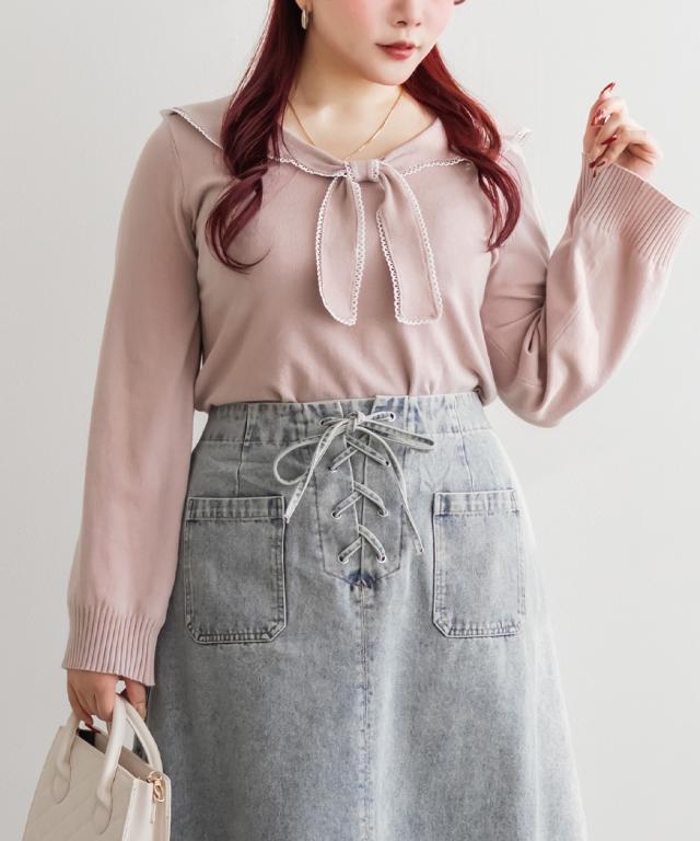 | 3Lを着て着用感はちょうどよく、もちっとしたニット素材がやわらかく体にフィットしてくれます。セーラーカラーは顔まわりが重くならず、レースのおかげで甘さも程よい印象でした。 袖口がほんのり広がっているので、腕まわりにゆとりがあり動かしやすいです。インでもアウトでもバランスが取りやすく、パンツ合わせなら上品に、スカート合わせならフェミニンに着られます◎ 一枚でコーデの主役になってくれるので、シンプルなボトムと合わせるだけでお洒落見えするのが嬉しいポイントです♪ |