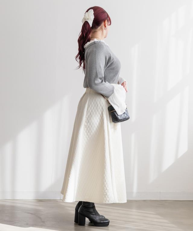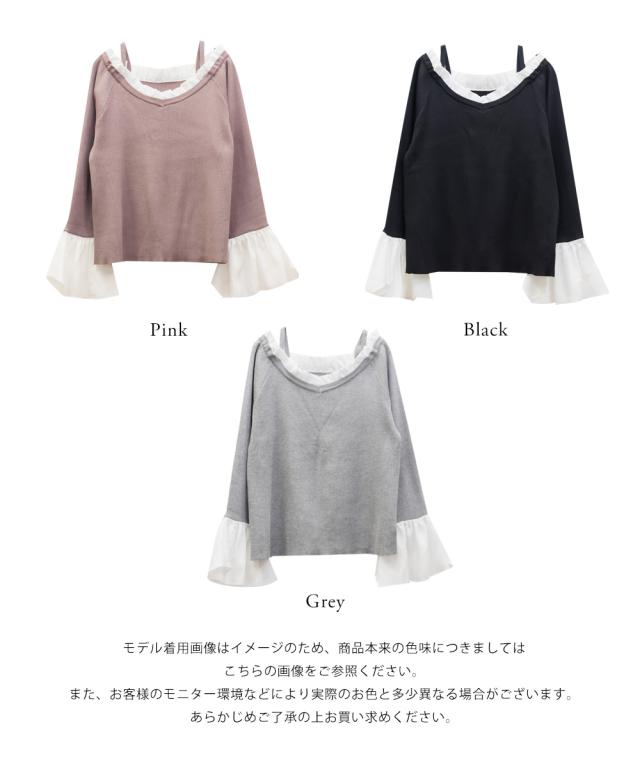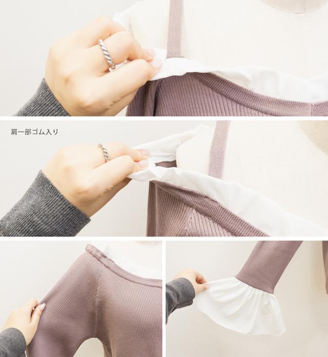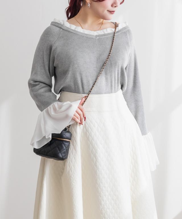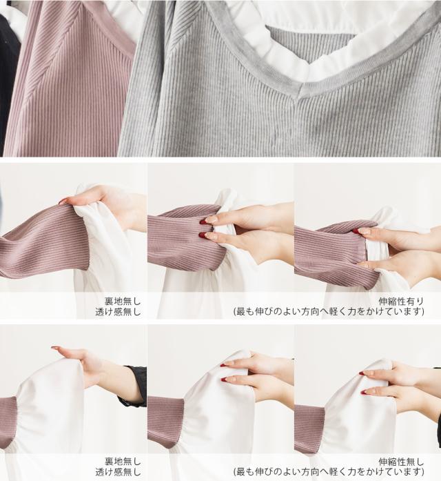 | 伸縮性のあるリブニット素材に落ち感のあるジョーゼット生地がドッキングされています。 |
