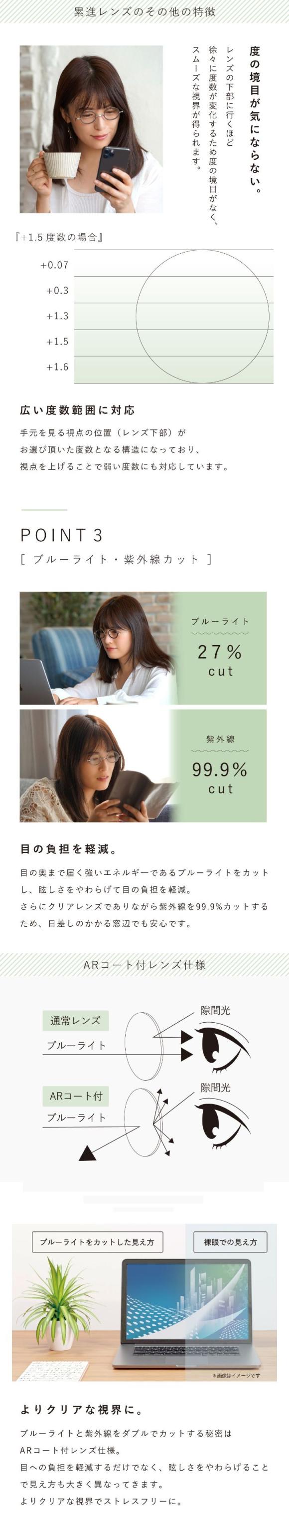 またレンズ上部に視線を合わせると、下部からグラデーションのように弱度数に変化している為、遠くの景色も見やすい仕様となっております。