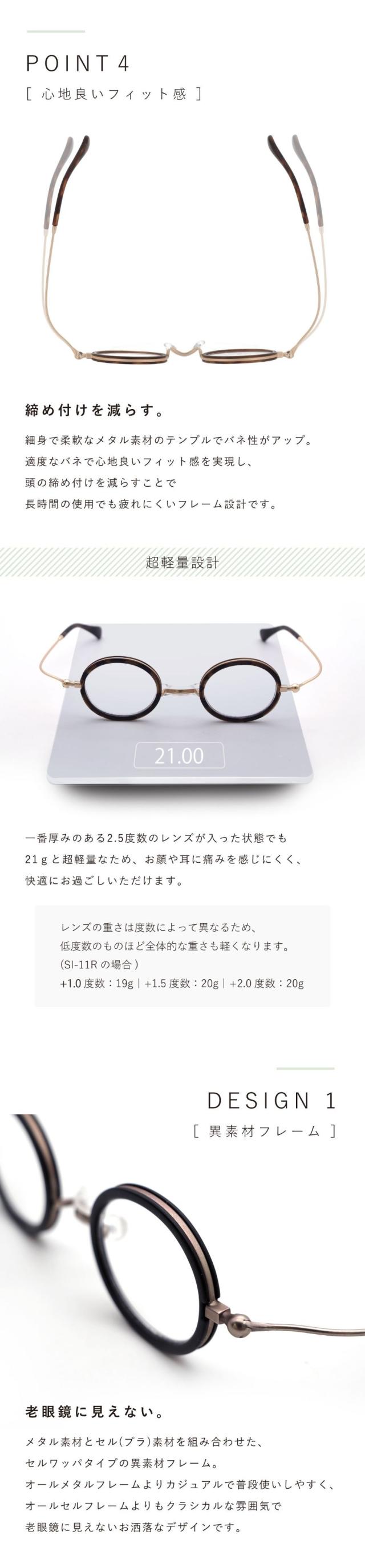 マットに仕上がったメタルとセルの異素材が高級感を漂わせ、老眼鏡とは思えないクラシカルなフレームです。