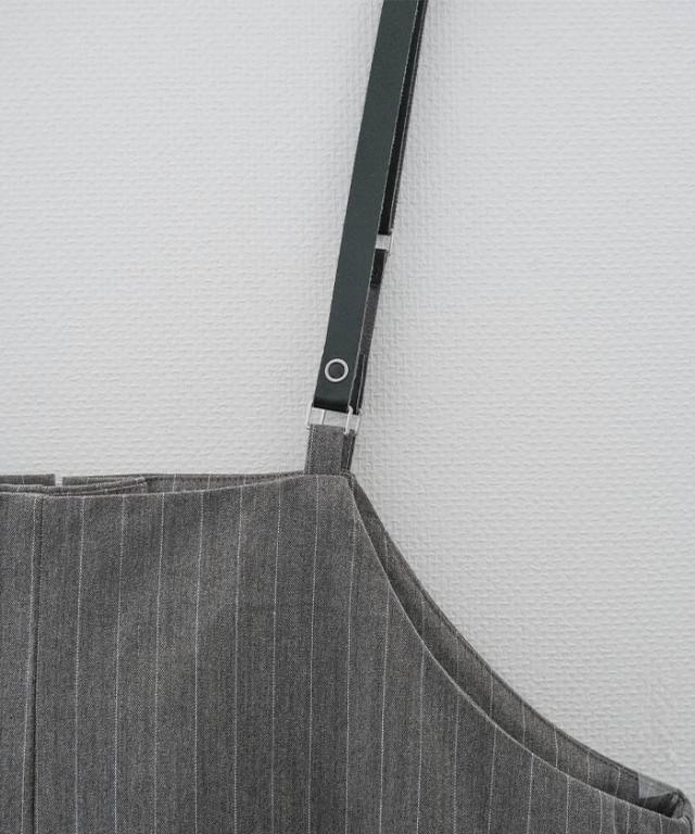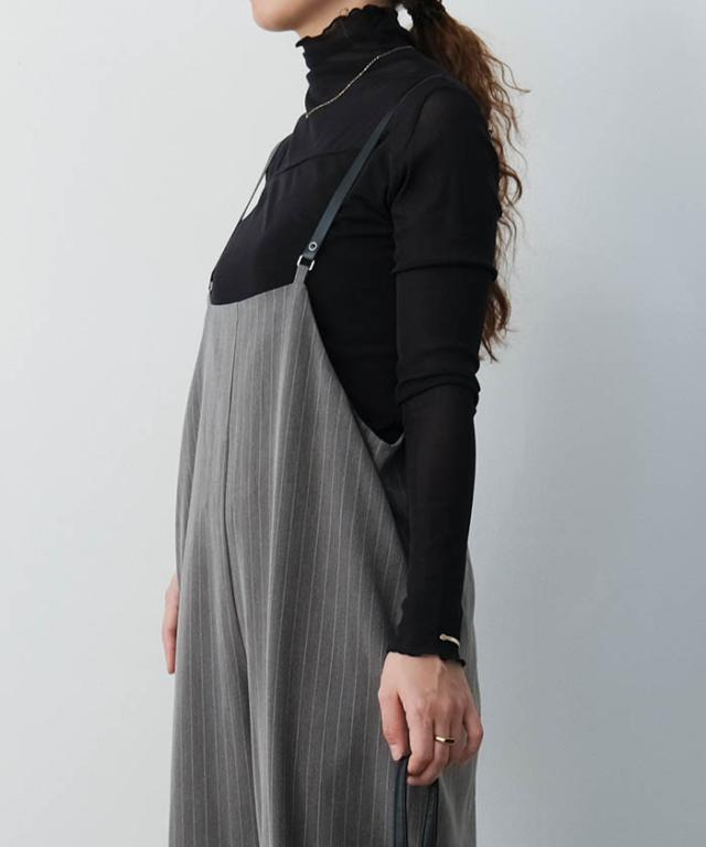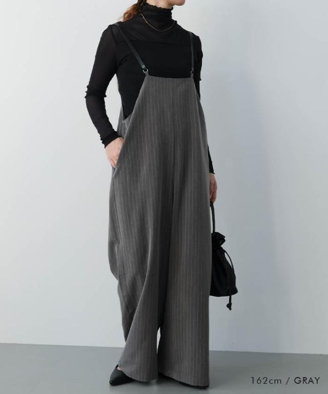 カジュアルになりがちなサロペットも、細めのストライプによってきちんと感がプラスされ、上品な雰囲気に。