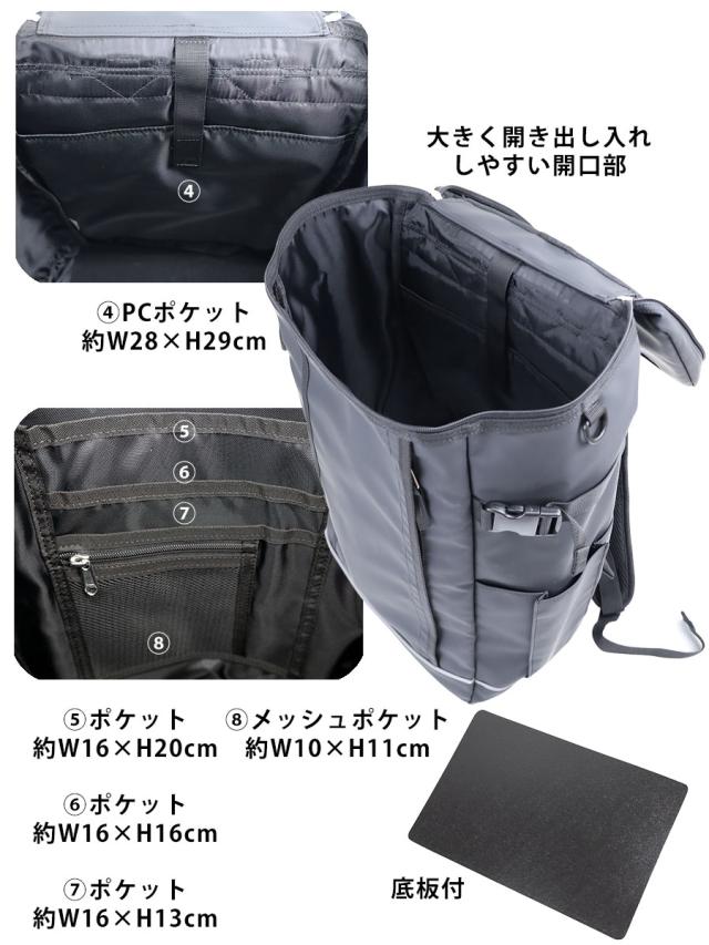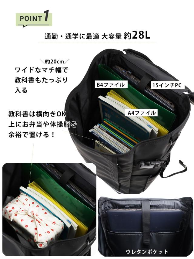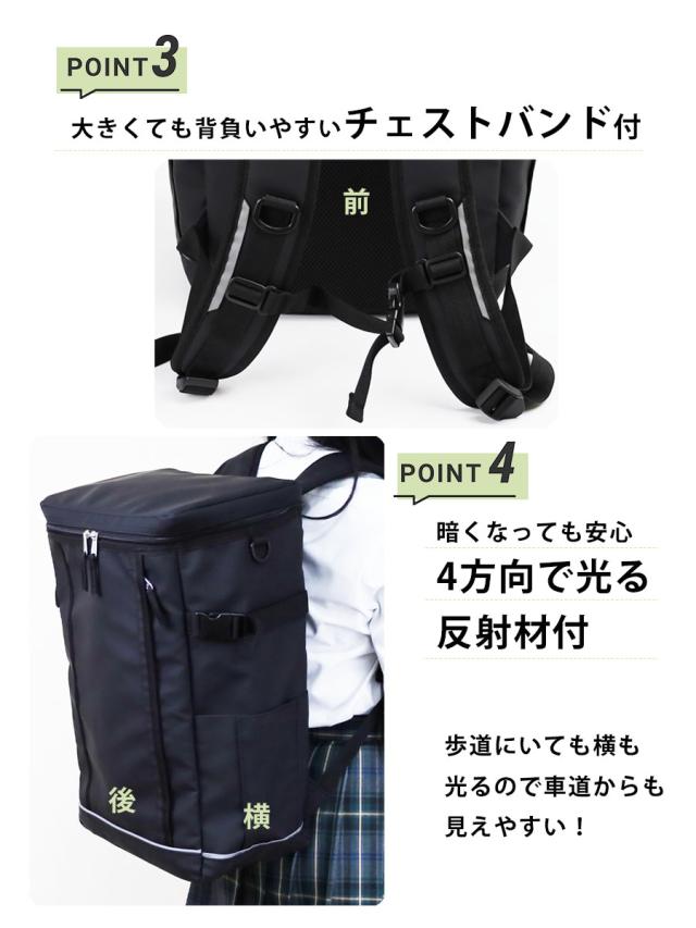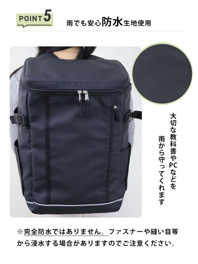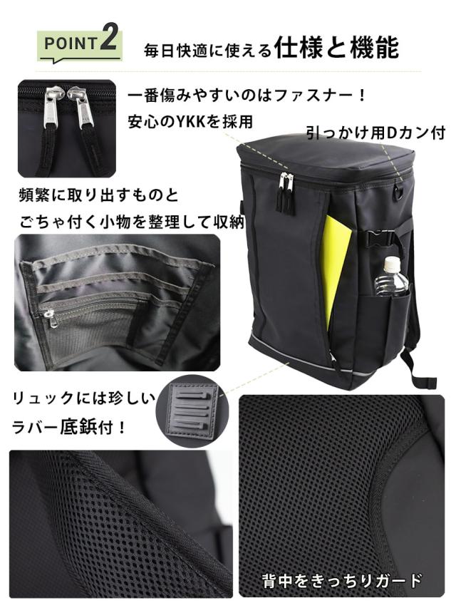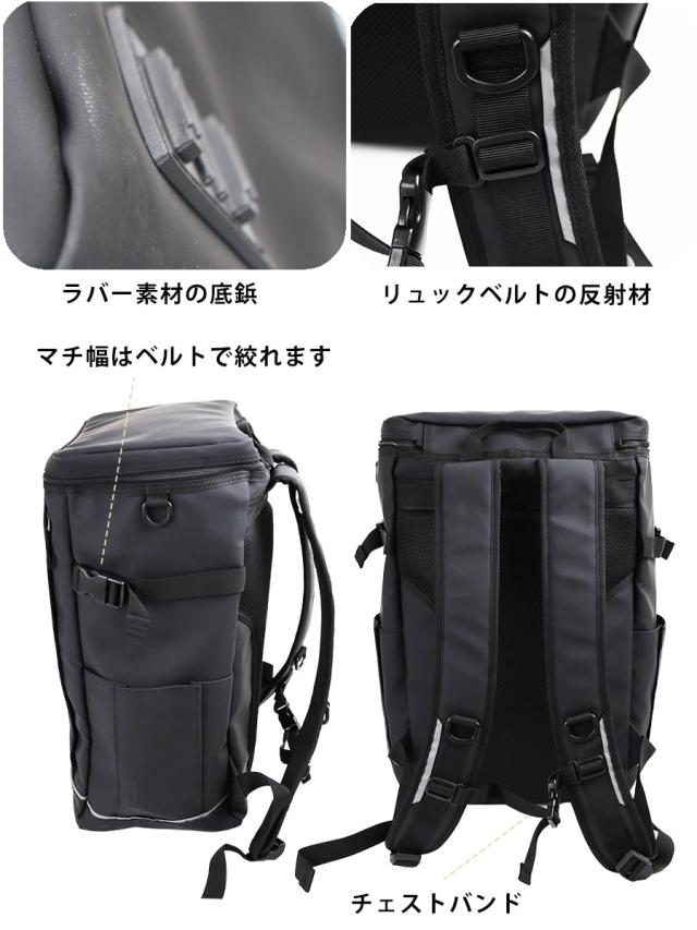 ■大容量約28Lのスクエア型の防水リュックサックです。大容量でも体の負担を少なく背負えるよう背面やリュックベルトにはしっかりとしたクッションが入っています。 ■樹脂加工防水生地を使用しています。※縫い目、ファスナー等から浸水する場合がありますのでご注意ください。ファスナーは安心のYKK社製。チェストバンド付きでしっかり背負うことができます。 ■ラバー底鋲が付いているので電車内など足元に置けて便利です。 ■前後左右4方向に反射材が付いており暗くなっても安心です。 ■B4ファイル対応、15インチPC対応サイズ。1ルームなので出し入れがスムーズです。底板付なのでお好みでお使いください。 |