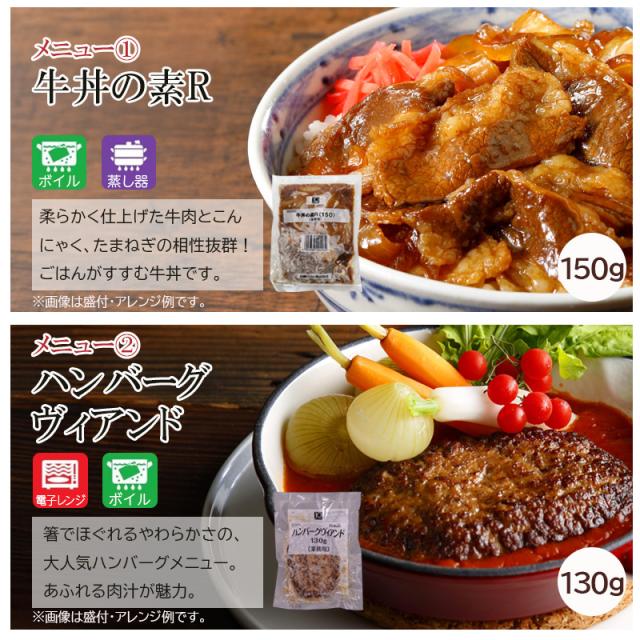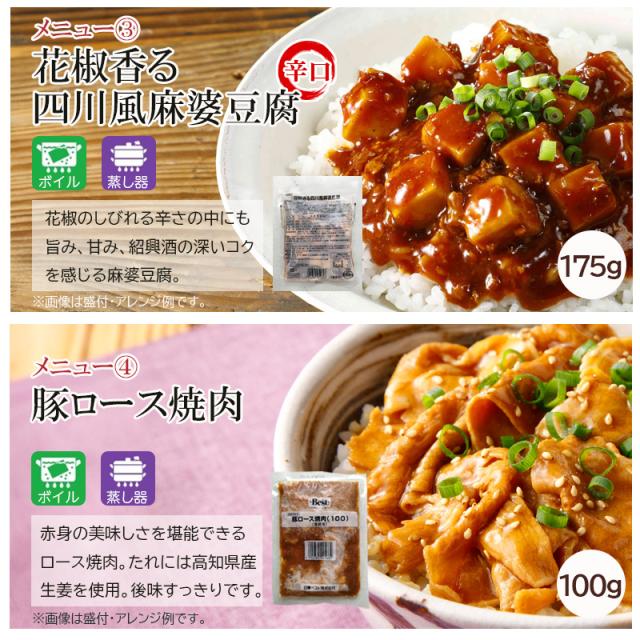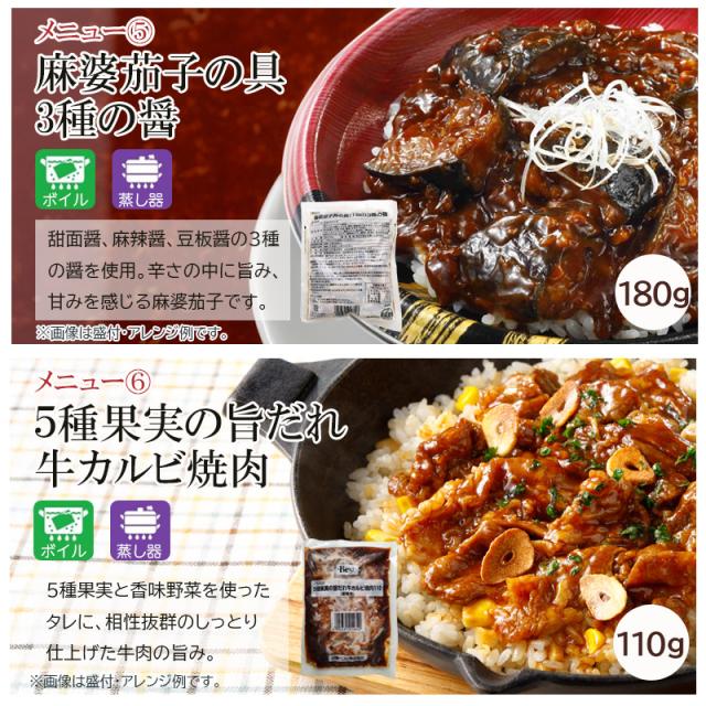 牛丼の素R(150g)、ハンバーグヴィアンド(130g)、花椒香る四川風麻婆豆腐(175g)、豚ロース焼肉(100g)、麻婆茄子丼の具(180g)、5種果実の旨だれ牛カルビ焼肉(110g)