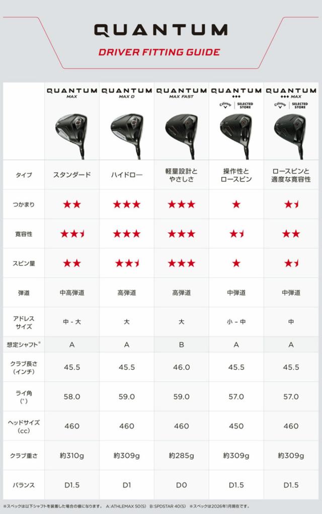 「QUANTUM」シリーズにおいては、より各々のプレーヤーにぴったりなクラブを提供するべく、フレックスや重量帯のバリエーションも豊富なオリジナルシャフトを採用している点も見逃せません。今回のラインアップは、完全オリジナルブランドのATHLEMAX(アスレマックス)とSPDSTAR(エスピーディースター)、既存ブランドのシャフトを「QUANTUM」に合うよう調整したTENSEI GRAYという3種類。「QUANTUM MAXドライバー」では、SPEEDER NX GOLD 50とTOUR AD FI 5に加えて、ATHLEMAX 50と元調子に近い特性を持つTENSEI GRAY 60の合計4種類のシャフトが用意されています。