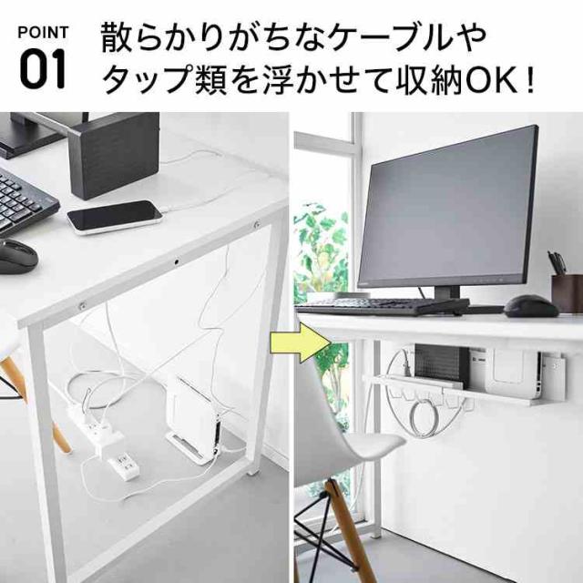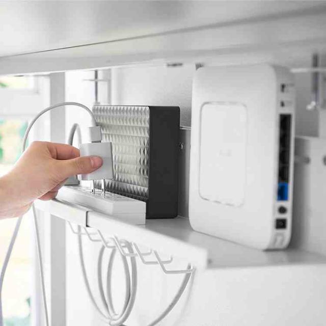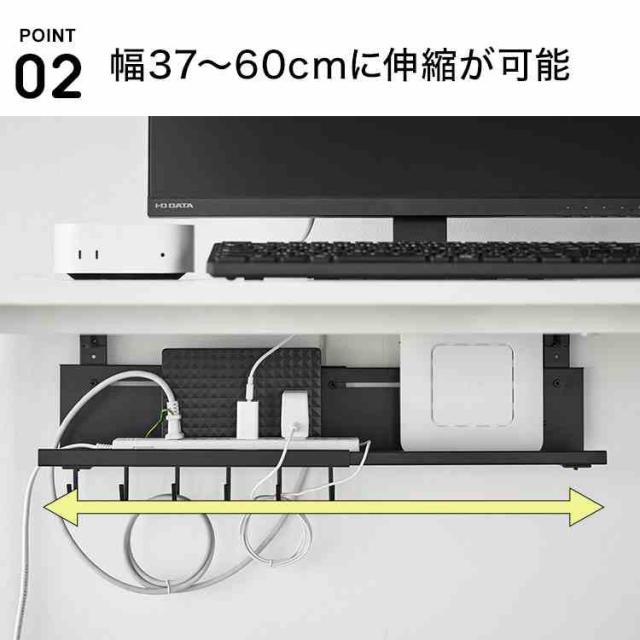 デスクの天板を挟み込むだけで簡単に設置できる、幅37〜60cmに伸縮可能なデスク下収納トレーです。散らかりがちなケーブルやタップ類を浮かせて収納できるので、デスク下がスッキリ片付き、床掃除もラクラク。
