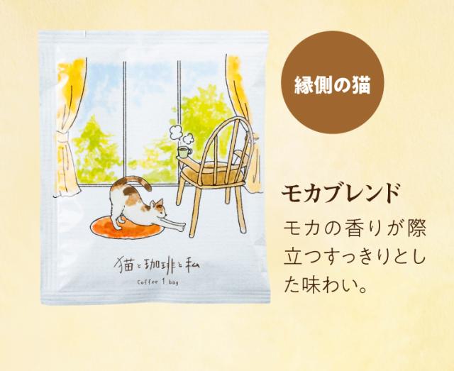 | 原材料(猫と珈琲と私(ドリップコーヒー)) | コーヒー豆 ・マイルドブレンド(ブラジル、ホンジュラス他) ・モカブレンド(エチオピア、ブラジル他) ・ヨーロピアンブレンド(ブラジル、ホンジュラス他) |
