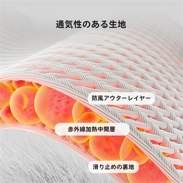 ・通気性素材、軽量で保温性がありかさばらない。外層は防風、中間層は赤外線発熱、内層は滑り止め凸加工