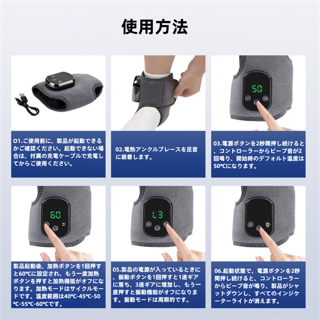 ・3段階マッサージ振動強度:日常ケア(1段階)、スポーツケア(2段階)、足首の不快感緩和(3段階)で多様なニーズに対応。