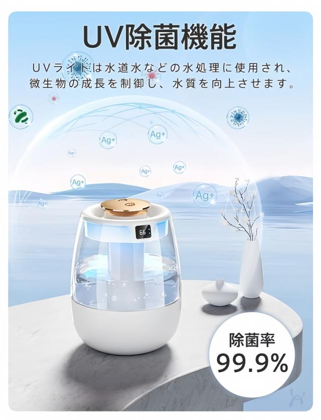 2つのミスト噴霧口が細かいミストで素早くお部屋をうるおす、水が積もることがない超音波方式を採用しています。