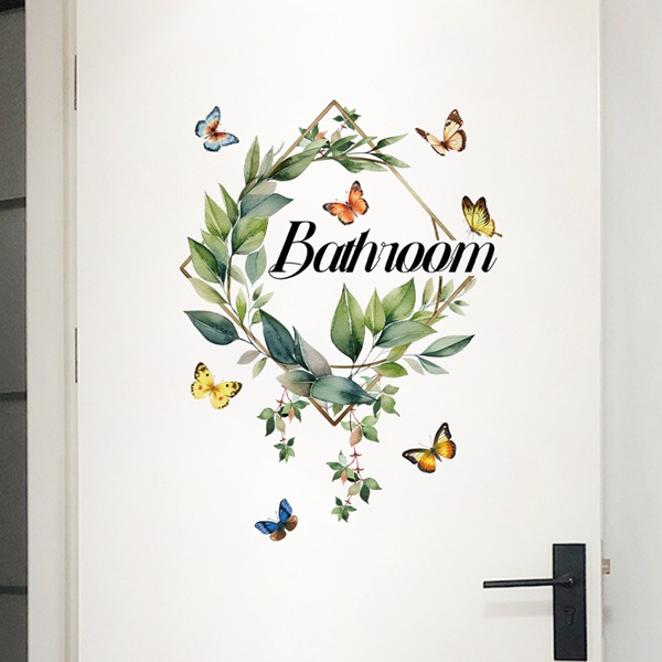 ウォールステッカー 月桂樹の葉 ローリエ 蝶 ボタニカル リース 壁シール 英字 来客用 トイレ 風呂 浴室 バスルーム ドア 緑 送料無料