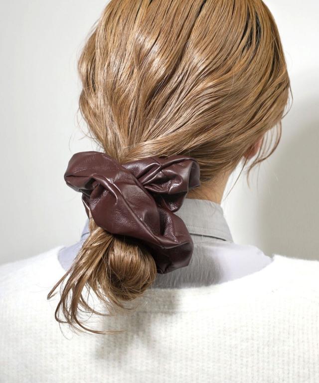レザー調の生地が、うしろ姿を大人っぽく仕上げるシュシュ。