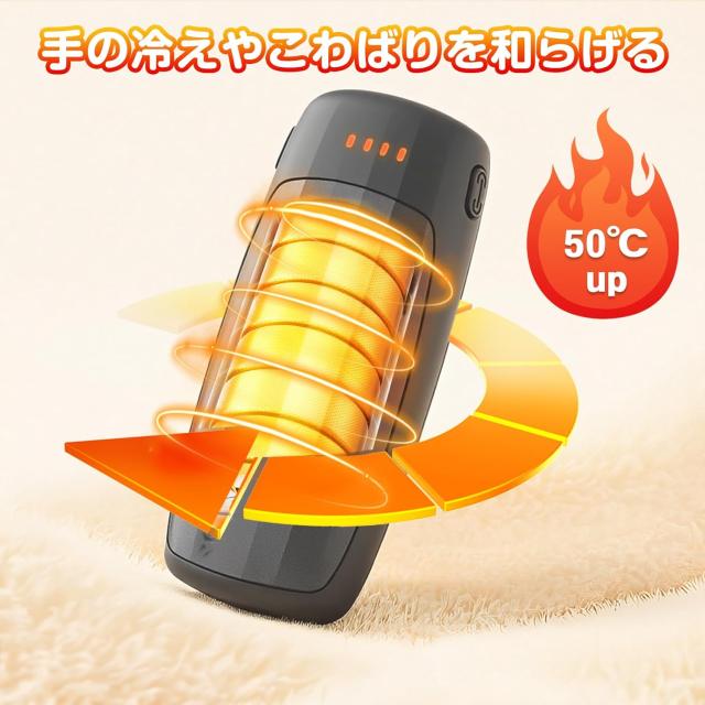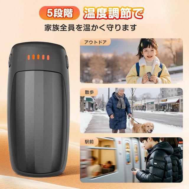 【5階段温度調整・操作簡単】5段階の温度(赤色ランプ数で表示:1階段37-40℃、2階段40-43℃、3階段43-47℃、4階段47-51℃、5階段51-55℃)設定があります。電源ボタンを短押しして、環境温度によって適切な温度を調節できます。不要な時は長押しすると電源が切れるのもとても便利です。??ご注意*高温モードは、女性の方や皮膚が薄いかたには、温度が熱すぎると感じるかもしれません。火傷を防ぐことにぜひご注意ください。??注意??過温保護の機能及び稼働時間の保障機能で、充電式カイロを使用中に温度が上がったり下がったりするのは正常な現象です。