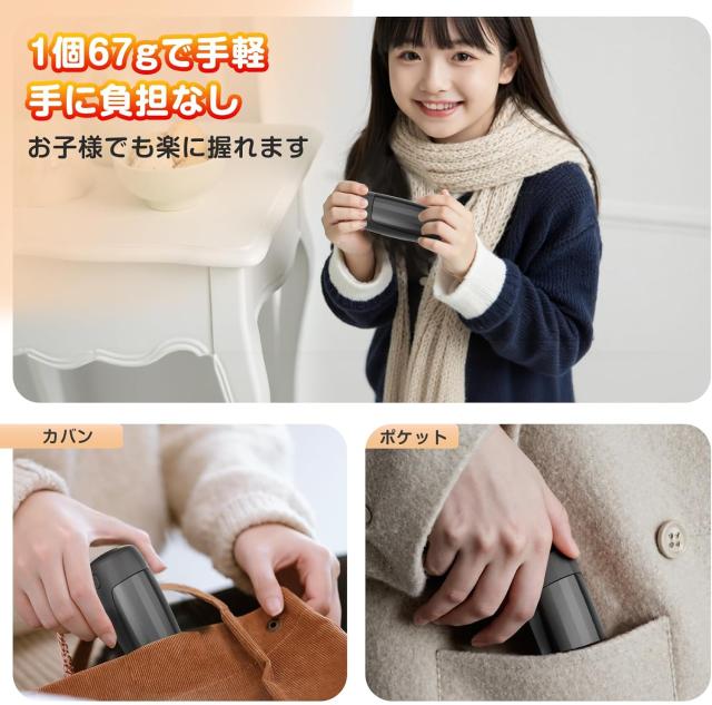 【小型軽量・省エネ】1個の重量はわずか67gで、女性やお子様でもストレスなく握りやすいデザインになっています。さらに、充電式カイロは充電すれば繰り返し使用できるので、余計なゴミが出ず、環境に優しいです。気になる電気代は1回の充電は約0.96円で、1ヶ月使用しても100円未満で、財布にもやさしいです!冬の外出に欠かせないアイテム。大切な人と一緒に、手軽で便利な急速充電式カイロで、より多くの温かい思い出を作りましょう。